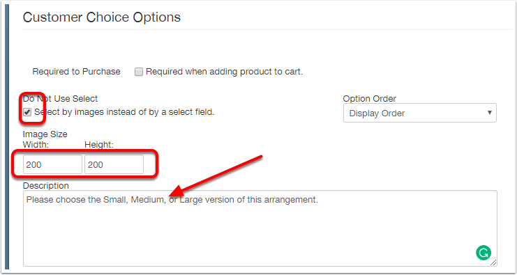 Set the image size, enter a description or instructions for the customer, and check the "Select by images…" box.