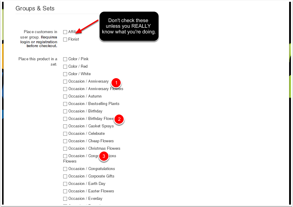 Select the appropriate Sets (aka categories or groups) for the product.