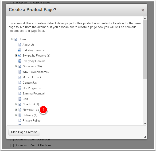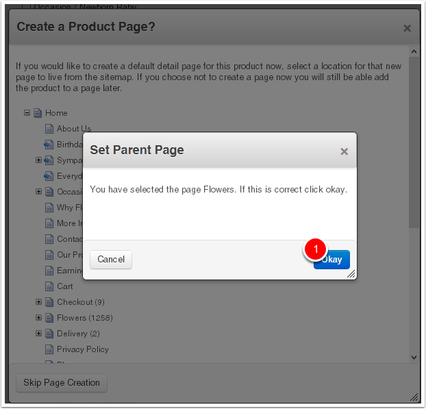 Create the product detail page by selecting its Parent Page. Choose the "Flowers" page.
