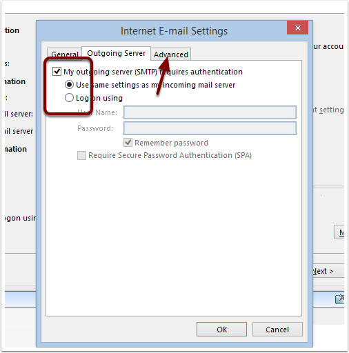 On the Outgoing Server tab, check "Requires Authentication" and "Use Same Settings", then click the Advanced tab.